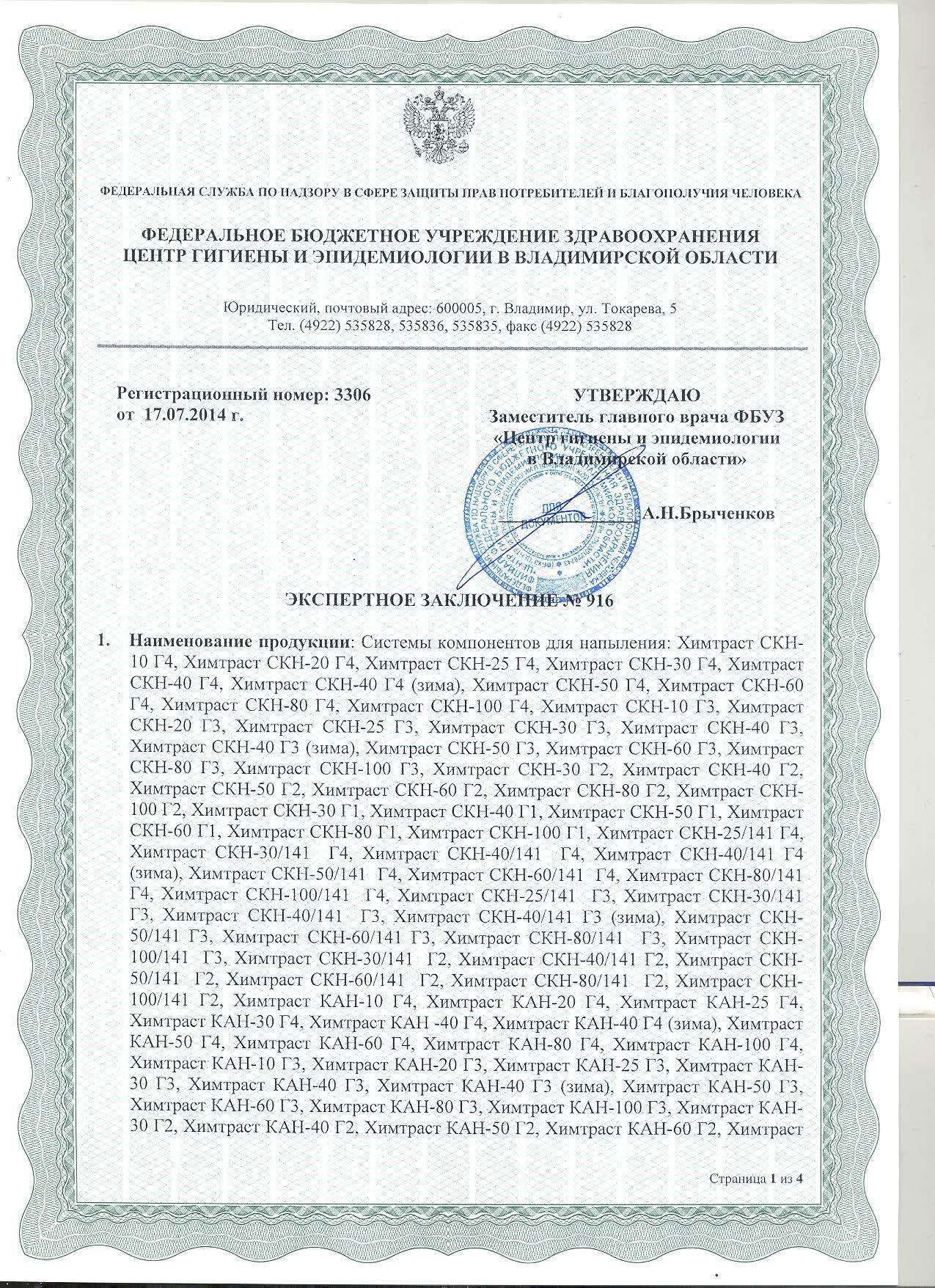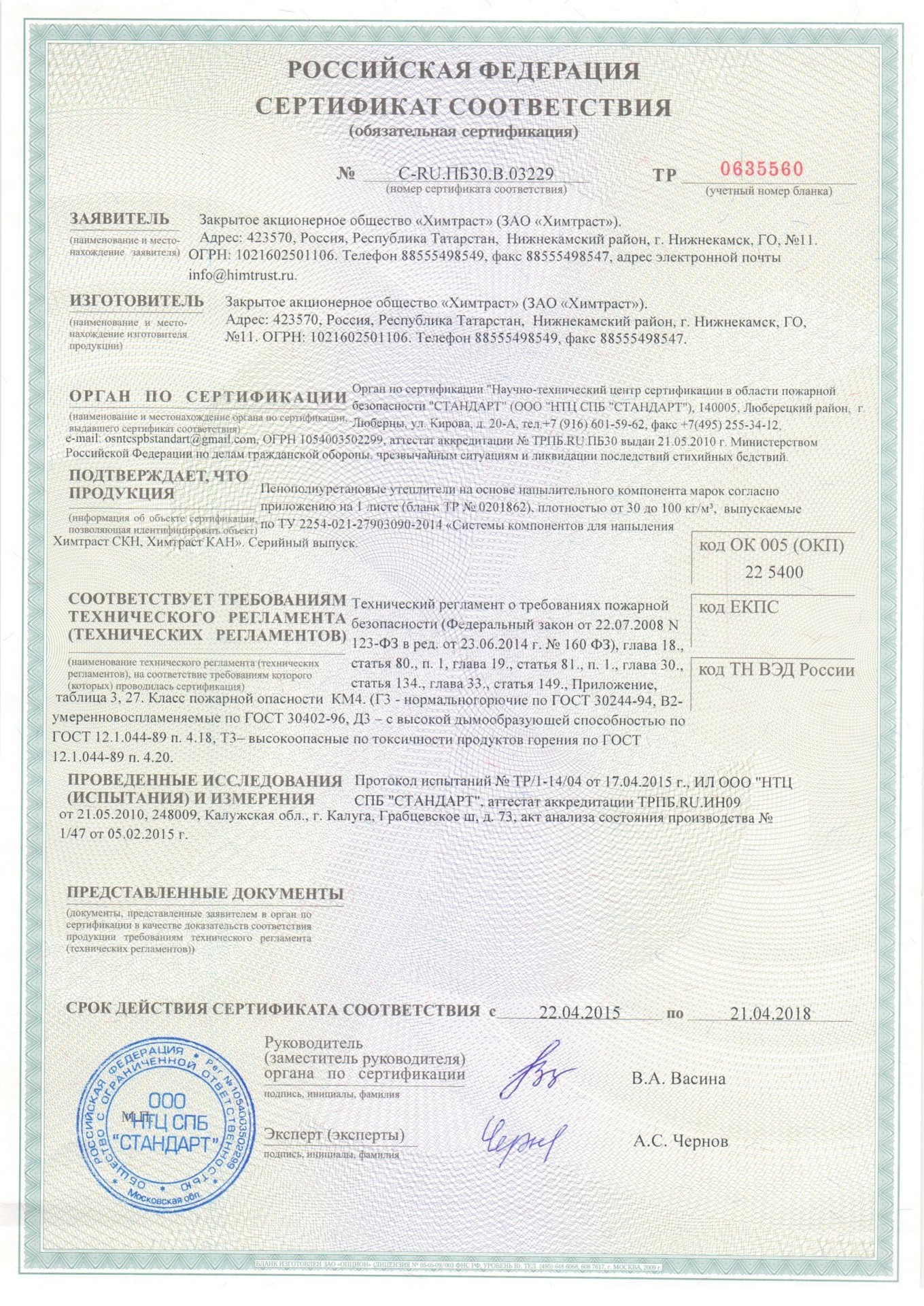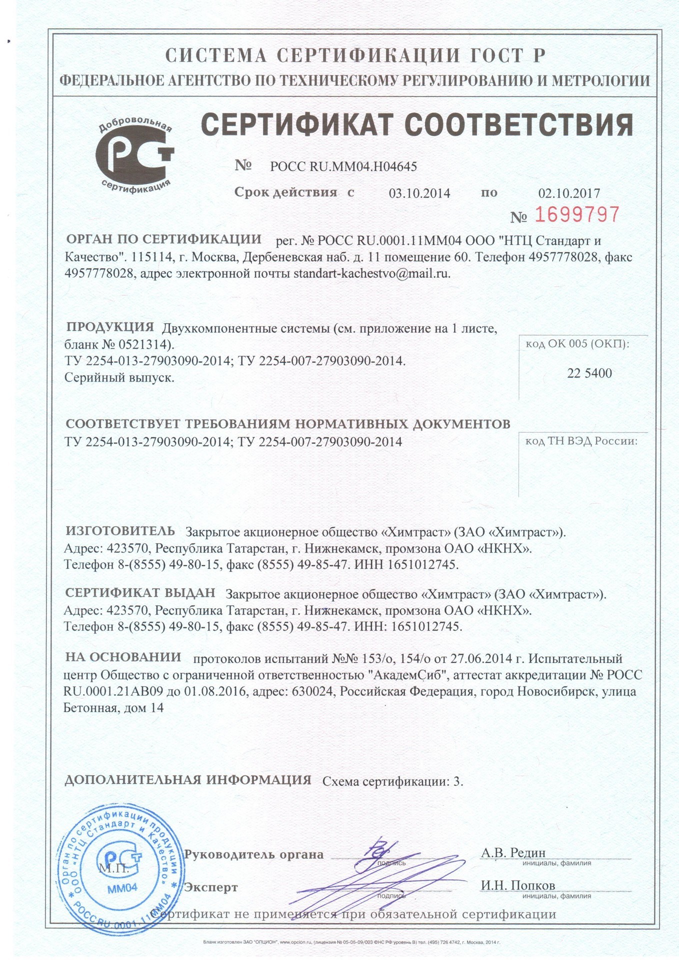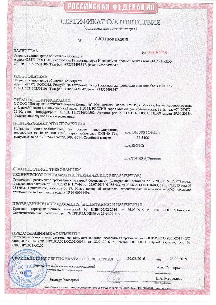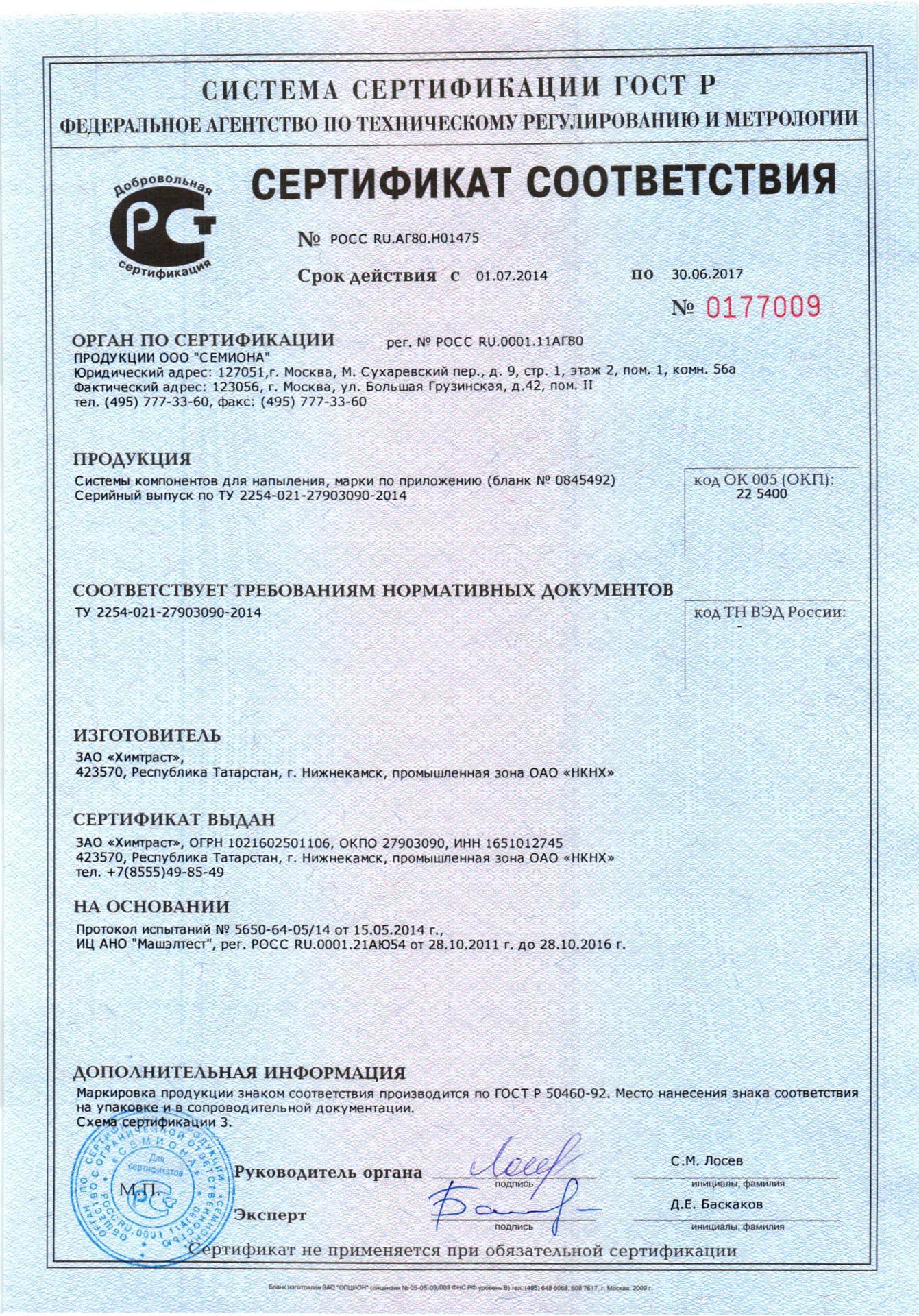 Сертификат соответствия на физико-механические свойства напылительных систем